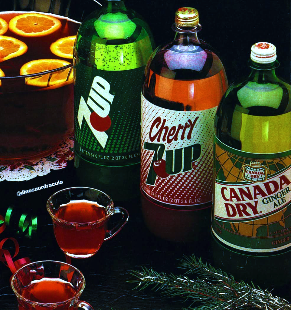 Actually, all three sodas from this old magazine ad scream “Christmas” to me. Seven and Sevens were wildly popular in the ‘80s, and my family went through gallons of that shit on Christmas Eve. I’m not sure which cocktails the adults were making with Canada Dry, but as that was my personal favorite, they had to act fast if they wanted any.