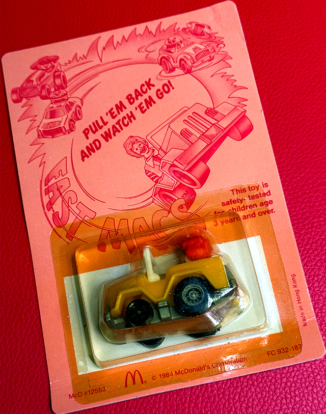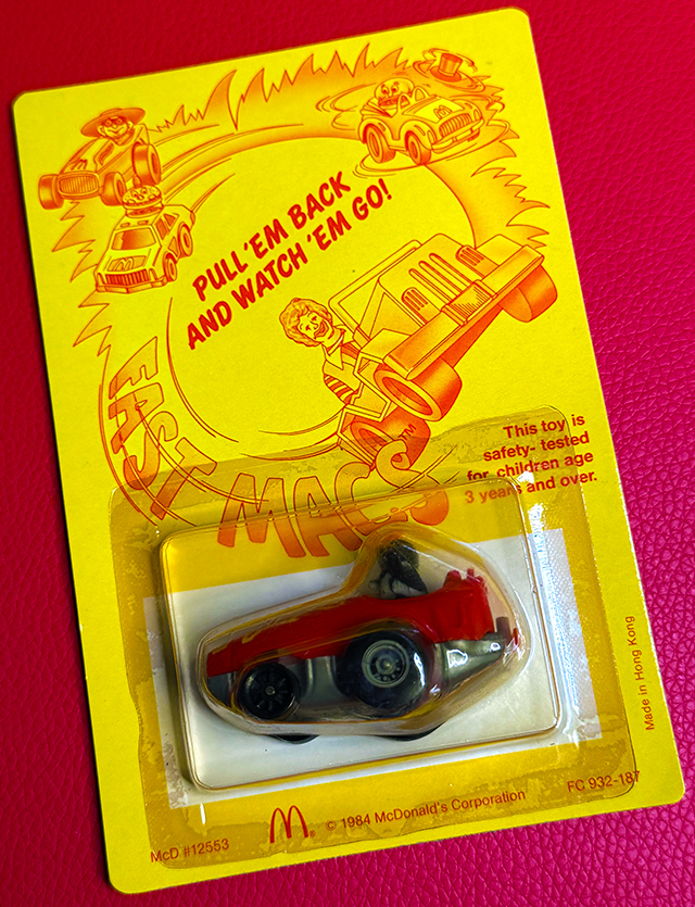 I adored these tiny-sized pull-back cars as a kid. You’ll either get Hamburglar or Ronald, pulled at random, but I should mention that I have way more of the former in stock, so Ronald’s a rarer pull.