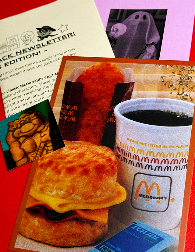 Then there’s this month’s exclusive 5×7” cardstock mini-poster, featuring a classic McDonald’s breakfast from the ‘80s, and a 2×2” sticker, starring an old Ninja Turtles cookie. How joyous.