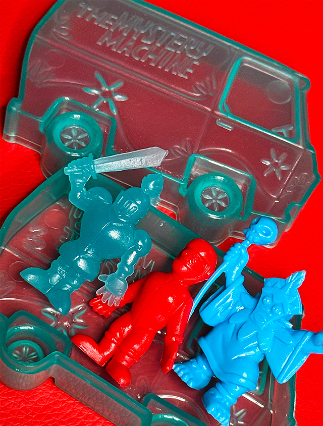 These are just too cool. You get a plastic, split-apart Mystery Machine van containing three random Scooby-Doo Tiny Mights figures, featuring the expected characters, along with a slew of monstrous villains. There are tons of colors in the mix, including rarer variants, like glow-in-the-dark and “sparkle” figures.