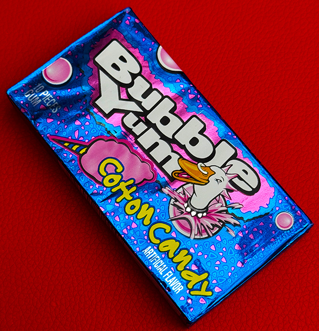 For this month’s snack, you’re getting a generous 10-piece pack of Cotton Candy Bubble Yum! This one has flitted in and out of production since its debut in the 1990s, but it’s currently in production, and clocks as a “forever nostalgic” flavor.