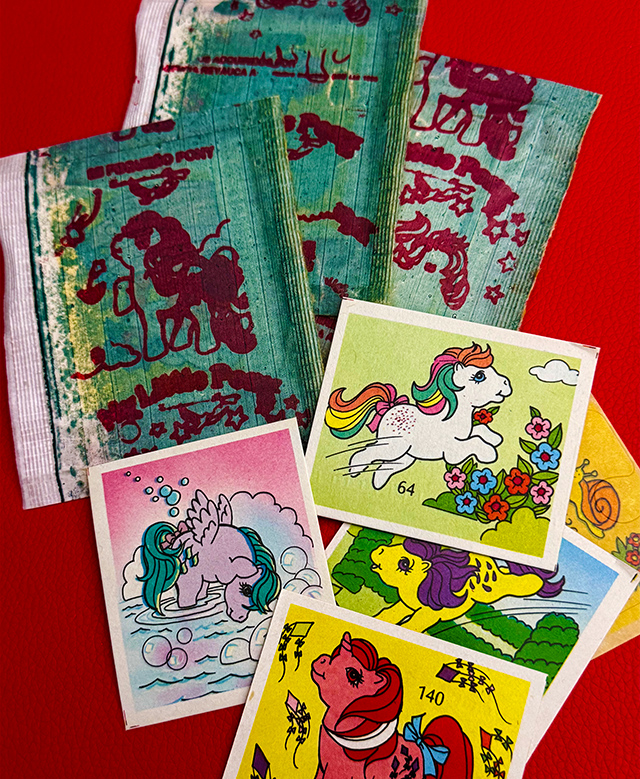 Man, there’s still more? What VALUES I bestow upon you. You’ll ALSO get three packs of these My Little Pony album “stickers,” from the mid ‘80s.