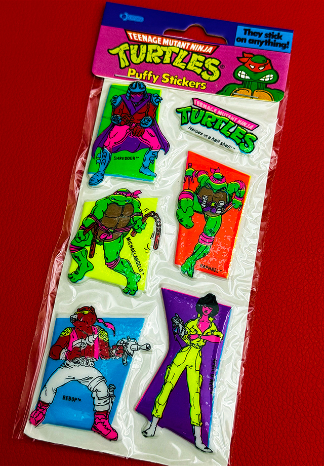 Next, you’ll each get a beautiful pack of Teenage Mutant Ninja Turtles puffy stickers, from 1989! What a score! These are actually imports from the Netherlands, but I believe we got the same sets in the States back then, too.