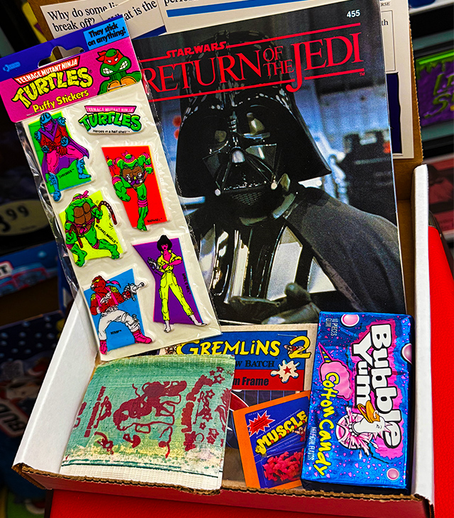 Rounding things out, you’ll also get this month’s Funpack Newsletter, an exclusive essay about how I love driving to horror conventions, a random set of three Mario Quiz Cards from 1995 (which are awesome), a 5×7” cardstock mini-poster featuring RC Cola, and a 2×2” sticker starring some old M.U.S.C.L.E. toys.