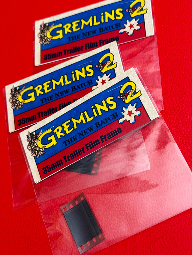 With that, you’ll each get one of these custom-packaged Gremlins 2 35mm trailer frames, cut by yours truly from a genuine trailer reel. Whichever frame you end up with, it’ll be something from the classic trailer, which absolutely floored all of us old school Gremlins fans back in 1990.