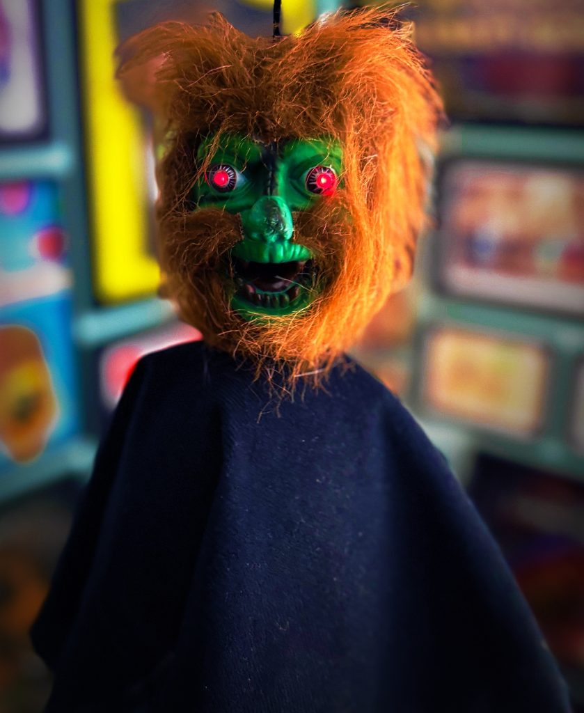 In 1992, the company – famous for the larger “motionettes” I’ve previously shown you – launched a series of Shaking Head Monsters. These diminutive demons used the same heads as the animated figures, but attached them to bell-shaped, battery-operated devices that caused them to scream and vibrate while their eyes lit up.