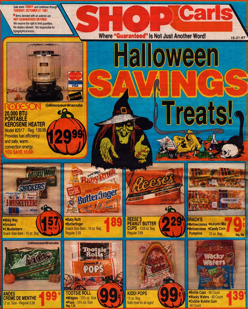 It’s always fun to see candy in its classic packaging, but I’m really showing you this advertisement for its design. That creepy witch! Those pumpkin price tags! The oddly-structured text, which inadvertently coined the phrase, “Halloween Savings Treats!” I adore all of this.
