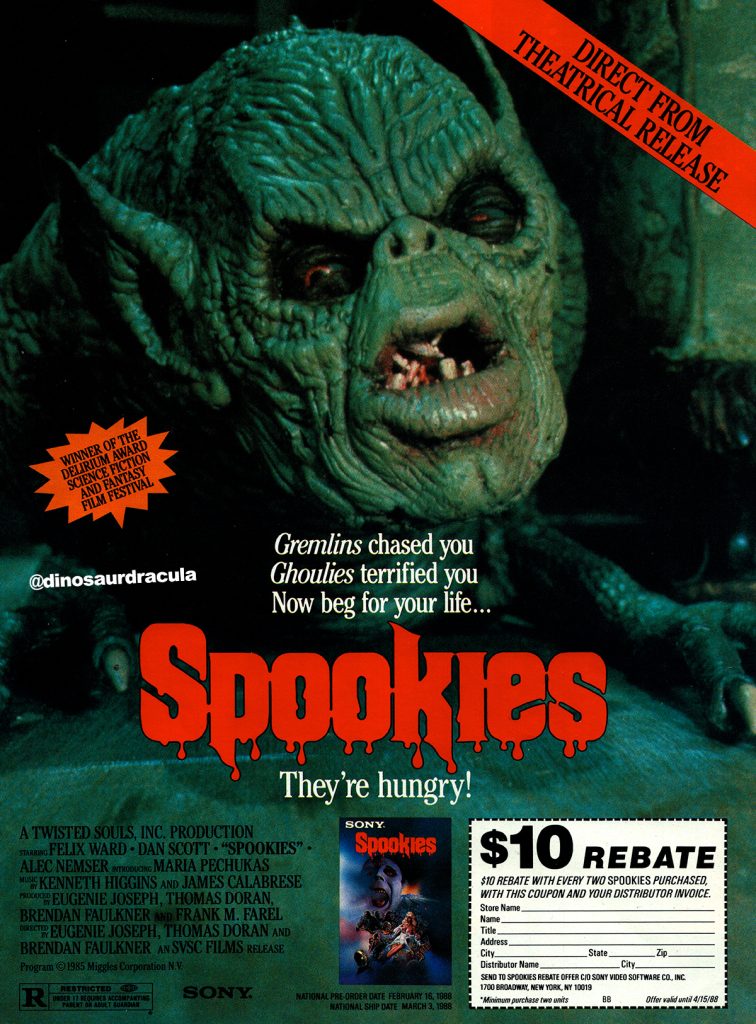 This old trade ad tried to persuade video store owners to invest in Spookies, the 1986 horror movie with a hysterically complex history. Essentially two distinct productions merged into a single film, the disjointed final product would be easier to poke fun of if Spookies wasn’t so freakin’ awesome.