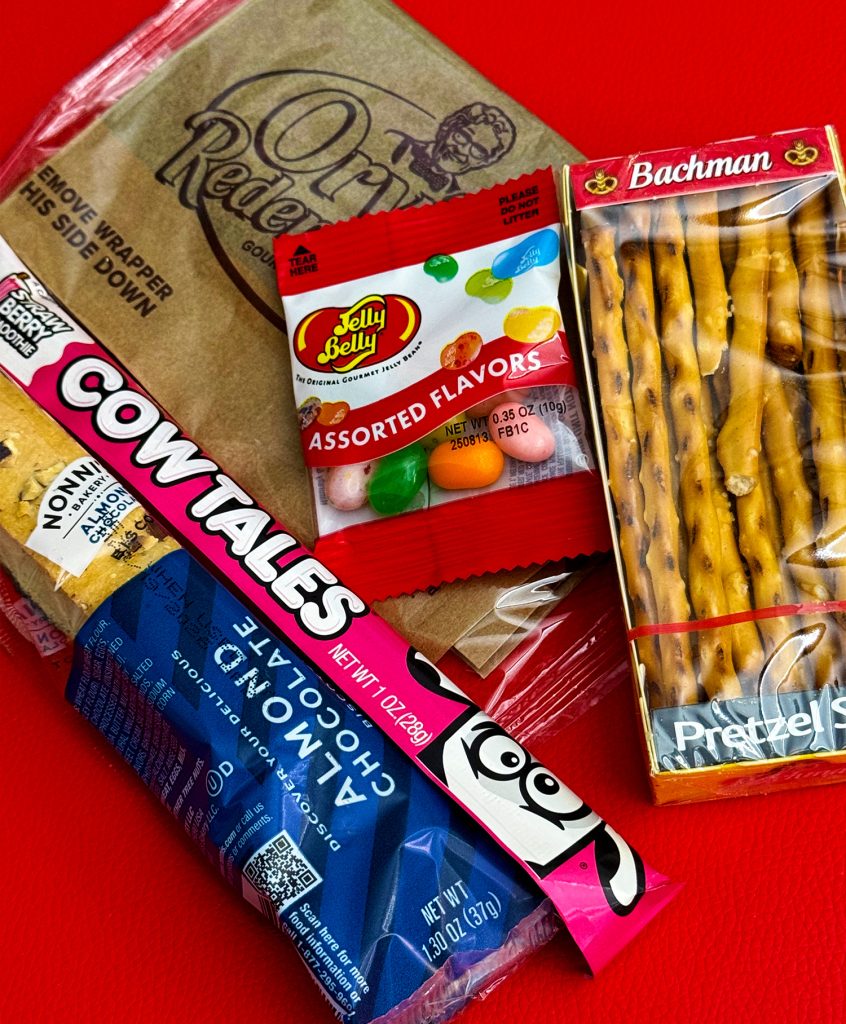 In each Snack Pack is a box of Bachman’s Pretzel Stix, a mini-bag of microwave buttered popcorn, a mini-bag of Jelly Belly jelly beans, and then new-for-2025, we have a generously-sized Nonni’s Almond Chocolate Biscotti standing in for the toast, and a Cow Tales Strawberry Smoothie candy stick in place of the ice cream sundae.