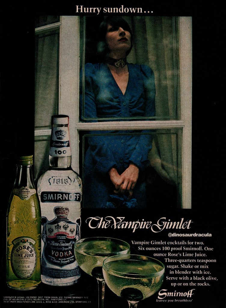 This 53-year-old magazine ad for Smirnoff Vodka combines two of my greatest loves – monsters, and antiquated quirky cocktails. I haven’t had a drink in years, but were I to break form, it’d definitely be for a Vampire Gimlet. Mostly just for the excuse to say “Vampire Gimlet” a few times.